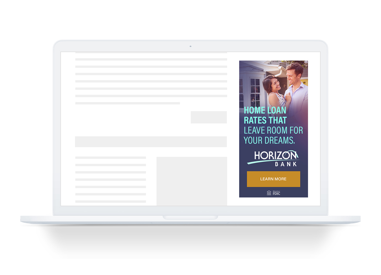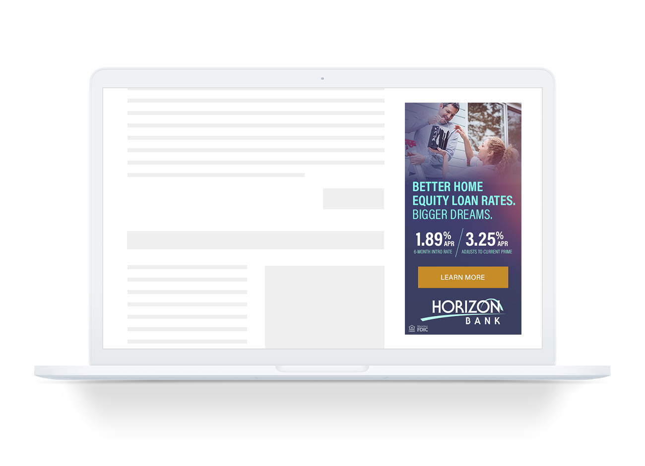 Target audiences in the Indiana and Michigan areas where Horizon Bank has more than 60 branches included search, display, retargeting, online video, streaming audio, outdoor boards and print advertising.