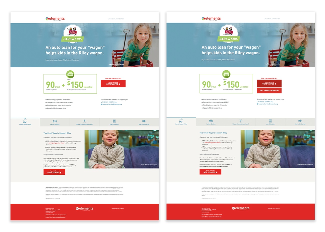 To test this theory, we ran the auto loan campaign as an A/B test. We showed half the users a new “Get Preapproved” call-to-action button alongside the original “Get Started” button on the landing page. The other half, the control group, was served only the “Get Started" option. Although the language was different, both buttons led to the application.