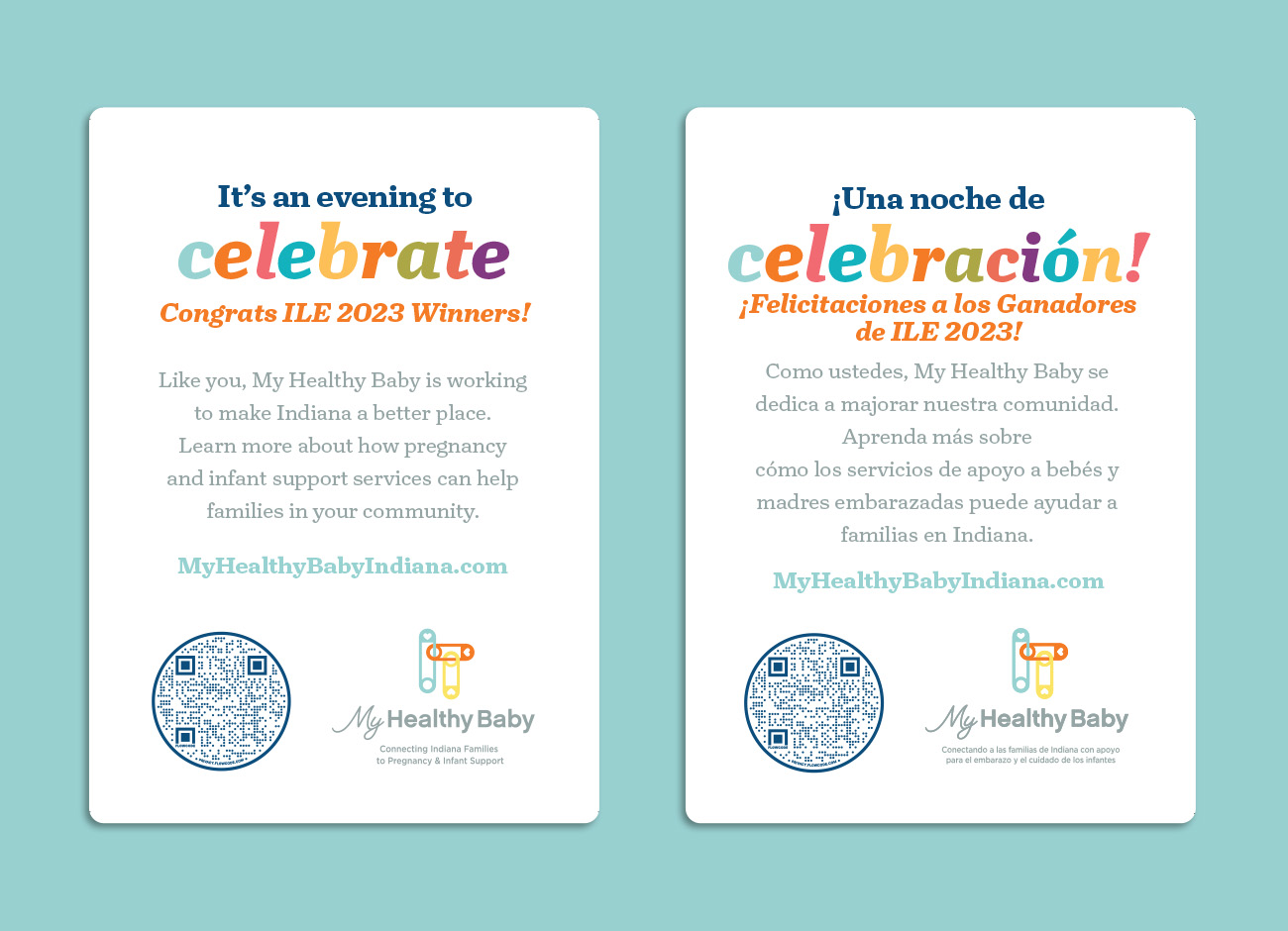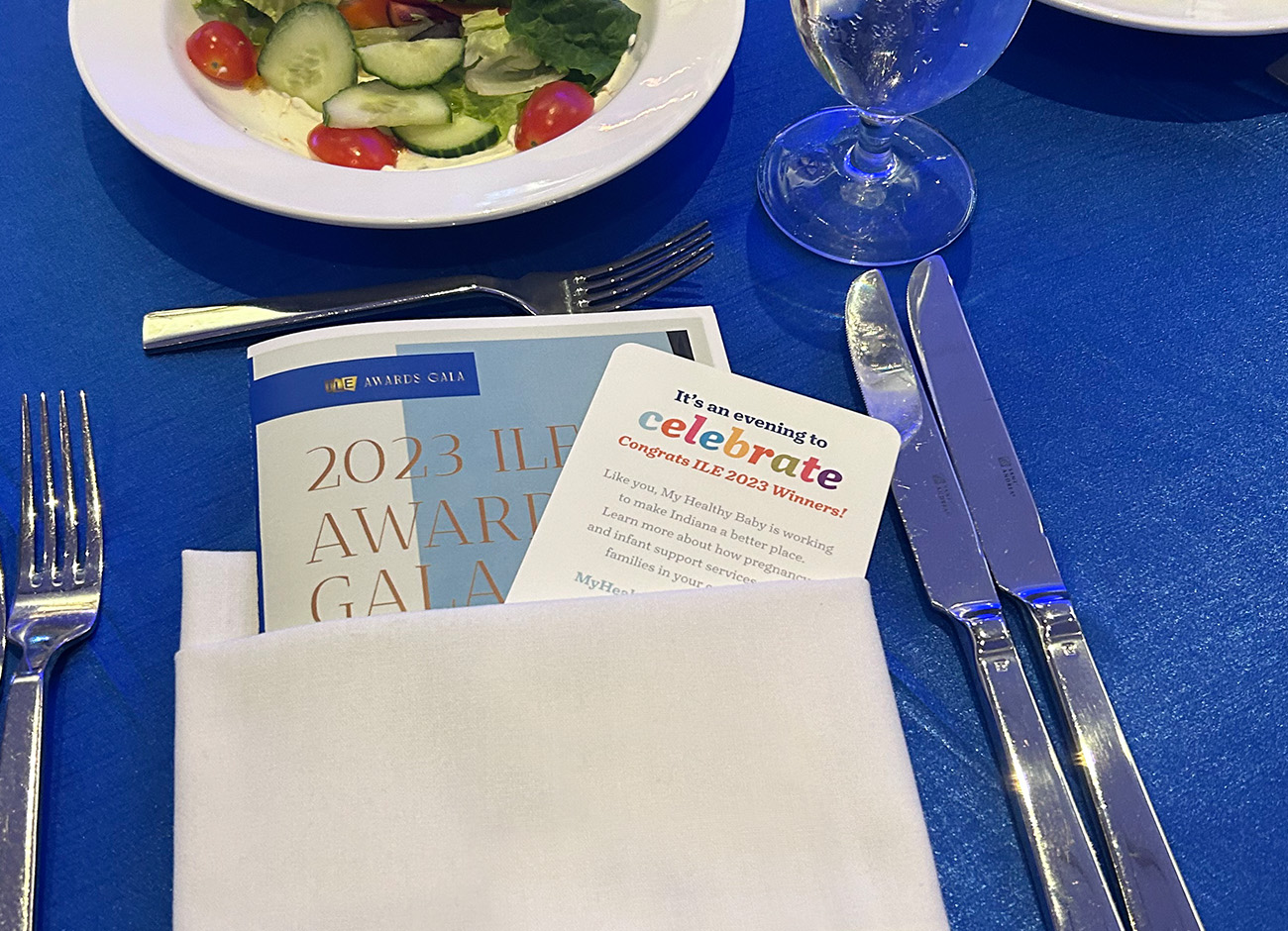 The place setting included a QR code that led to a landing page overlay (in English and Spanish) so attendees could learn more about the program if their curiosity was piqued. The donated Spanish and bilingual books were complete with custom stickers featuring My Healthy Baby, the ILE award winner’s name, and that winner’s hometown. The books will be given to Latino families in Indiana who participate in pregnancy and infant support programs.