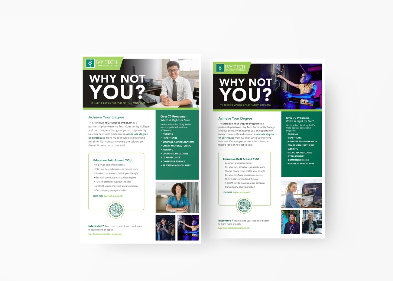 Take, for instance, the school’s Achieve Your Degree (AYD) program. AYD is a partnership between Ivy Tech Community College and nearly 300 local employers. When an employer becomes a partner, their employees can earn a job-relevant degree or certification with no upfront cost to the student. This program provides a path for companies to skill up their workforce and allows employees to learn new skills and earn a free credential from Ivy Tech while still working full-time. Unfortunately, this terrific company benefit was being underutilized, mostly due to a lack of awareness among the employees for whom it was created. Williams Randall was asked to help remedy the situation so we kicked off a campaign designed to do exactly that through the targeting of a very specific audience: the employees of a select group of those partner businesses.