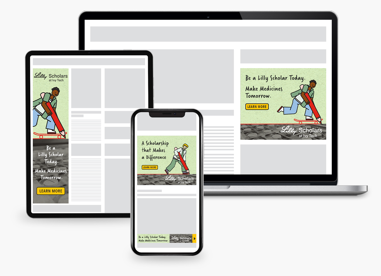 In addition to the animated spots, we created digital ads and a landing page, to provide interested students with some deeper insight into the program. Across all campaign collateral, we incorporated Ethan and two other animated Lilly Scholars, as well as language from the script, to create continuity and foster brand familiarity.