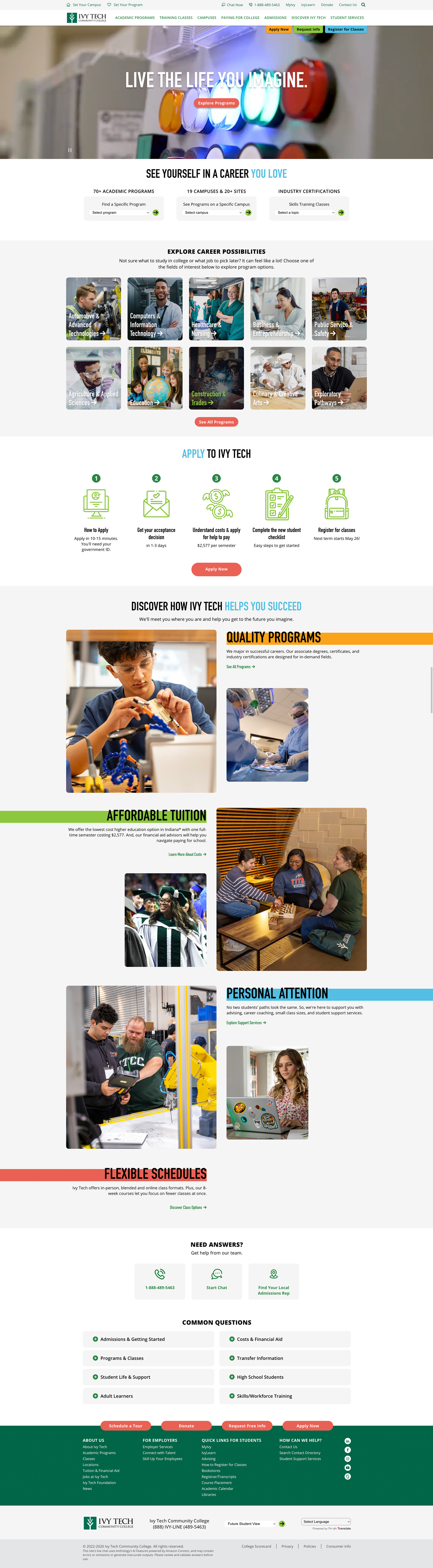 Finally, the homepage helps prospective students envision themselves at Ivy Tech. Large, authentic photography showcases programs, classrooms, interactions with faculty, and student life. Paired with these visuals, we highlight four core benefits—Quality Programs, Affordable Tuition, Personal Attention, and Flexible Schedules—to reinforce Ivy Tech’s value and help students imagine what success could look like for them.