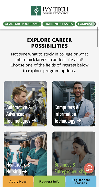 Stylistically, we aimed to make Ivy Tech’s homepage feel contemporary, welcoming, and reflective of the breadth of opportunities available. We modernized the design and incorporated photography and video throughout the page to help students see themselves at Ivy Tech and imagine future careers.