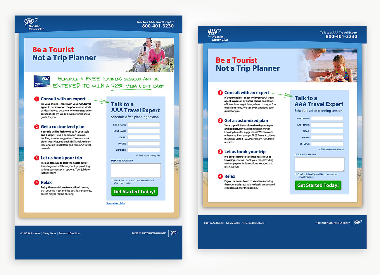 Our ad campaign targeted a very carefully selected online target audience, including a geographic region that overlapped with the AAA Hoosier Motor Club’s territory, and those individuals more likely to plan expensive, complicated trips best suited to travel planning assistance. WhichTestWon.com selected this test case as a 2014 B2C PPC Landing Page Silver Ribbon Winner! (As of March 2014, this winning case study is only available on the WhichTestWon.com website to premium members.)