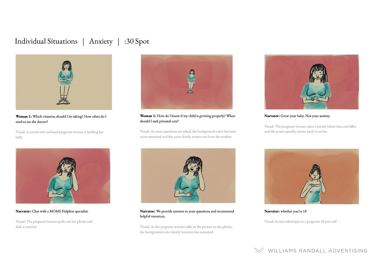In addition to our animations, we also created messaging and penned a tagline (“Moms Helpline: here for all Indiana moms and babies”) to emphasize the fact that Moms Helpline serves all Indiana mothers, regardless of income level or other demographic factors. This tagline, alongside the animations, creates continuity across all campaign collateral.
