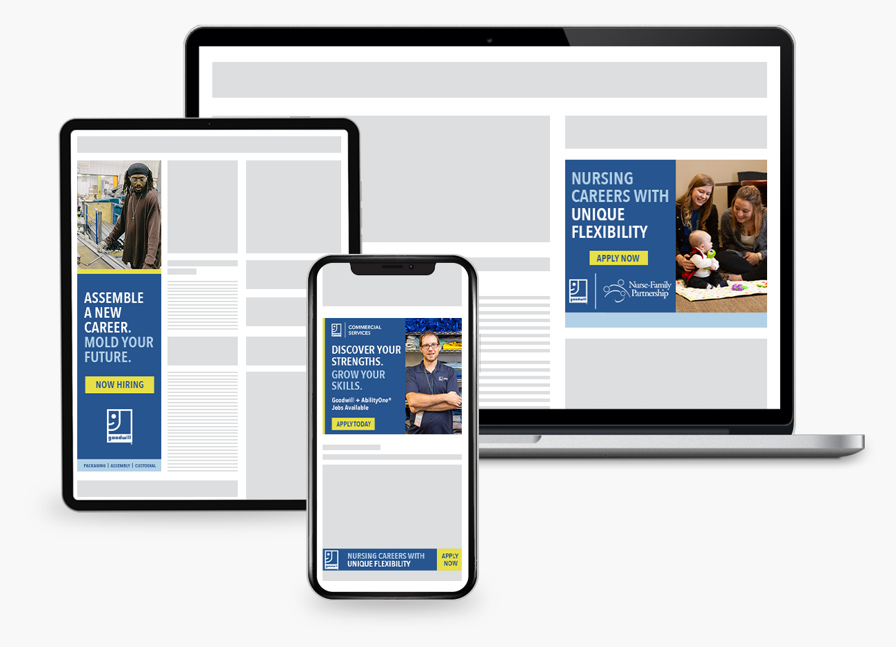 For the retail and commercial services roles, we targeted those generally looking for open positions (either full or part-time), layering in warehouse and retail position interest segments. For the open teaching roles, we targeted certified teachers who were looking to work at non-traditional schools like Goodwill’s Excel Center. Finally, for nursing, we targeted registered nurses who were looking to switch to more personal roles like those found in Goodwill’s Nurse-Family Partnership program. We employed a mix of media including Google Search, Google Display, and social media (Facebook and Instagram).